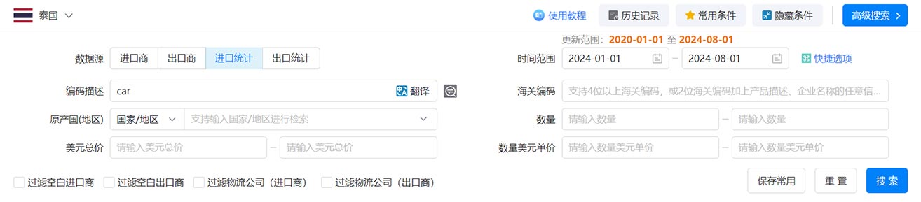 腾道海关进出口数据中泰国海关进出口数据的条件有:编码描述、海关编码、原产国(地区)、数量、美元总价、数量美元单价。