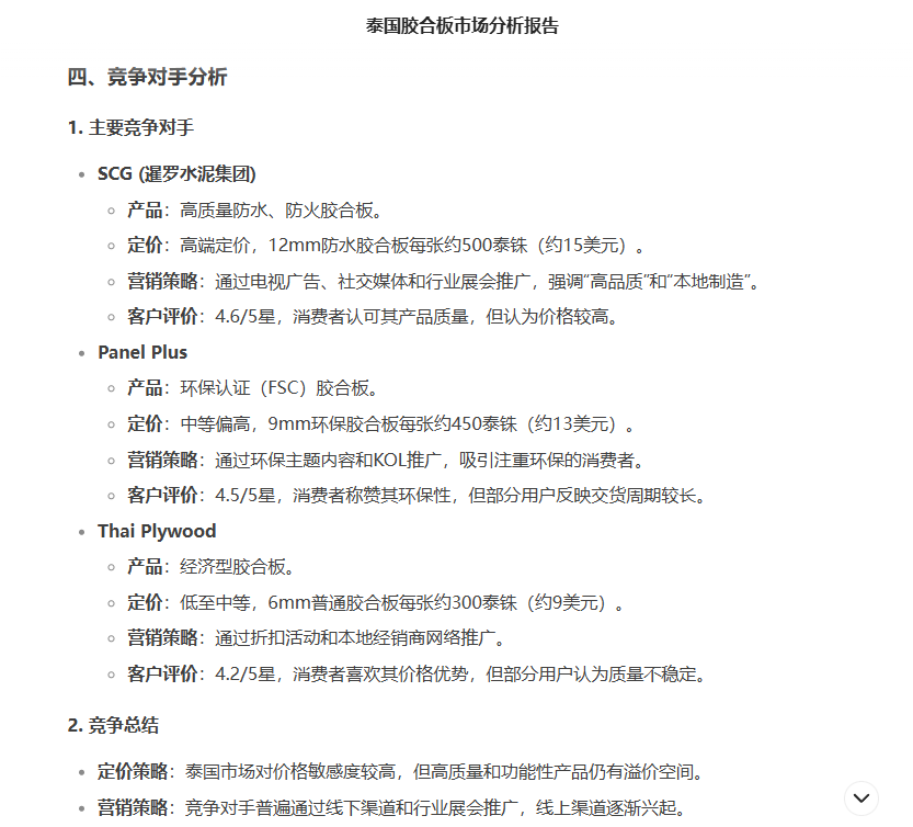 “作为一家做胶合板的外贸公司,请帮我生成一份详细的泰国市场分析报告。报告应包括:泰国市场的搜索趋势、消费者偏好、竞争对手分析(定价、营销策略、客户评价)。"