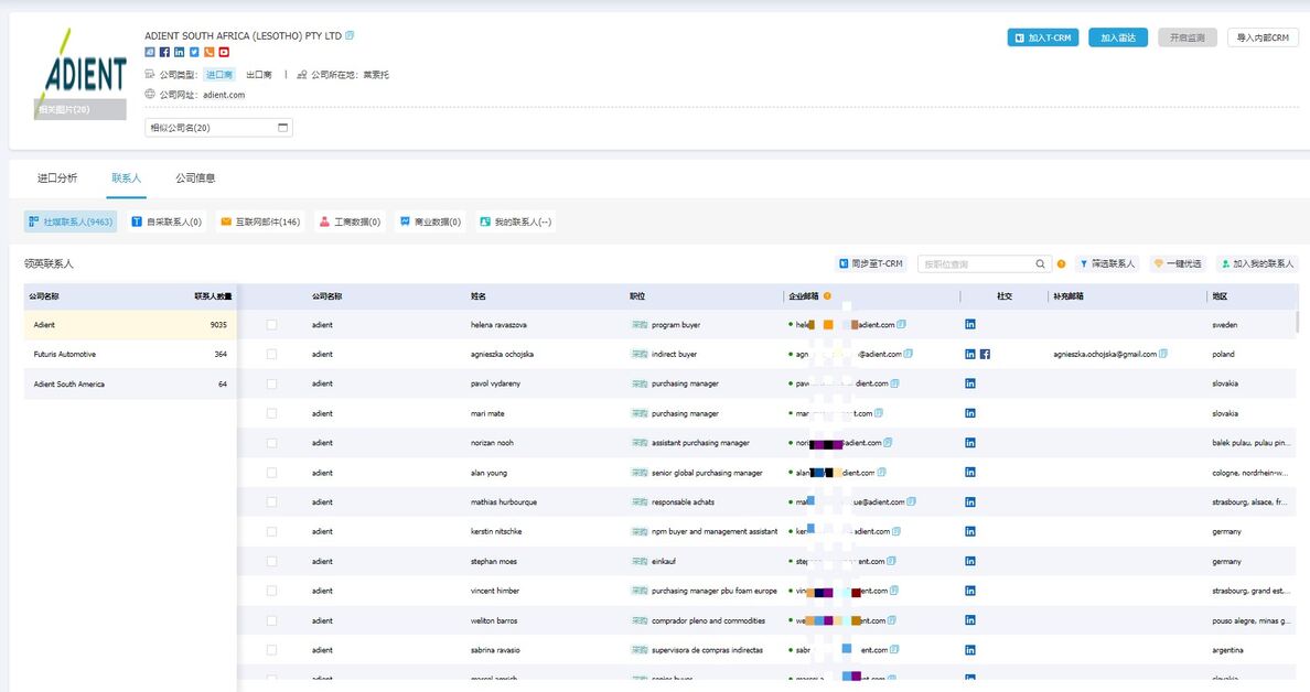 除了可以了解到进出口的详细记录,点击【联系人】,还可以通过公司名、公司网站搜索关键人的领英职位和邮箱,这样就可以发送。