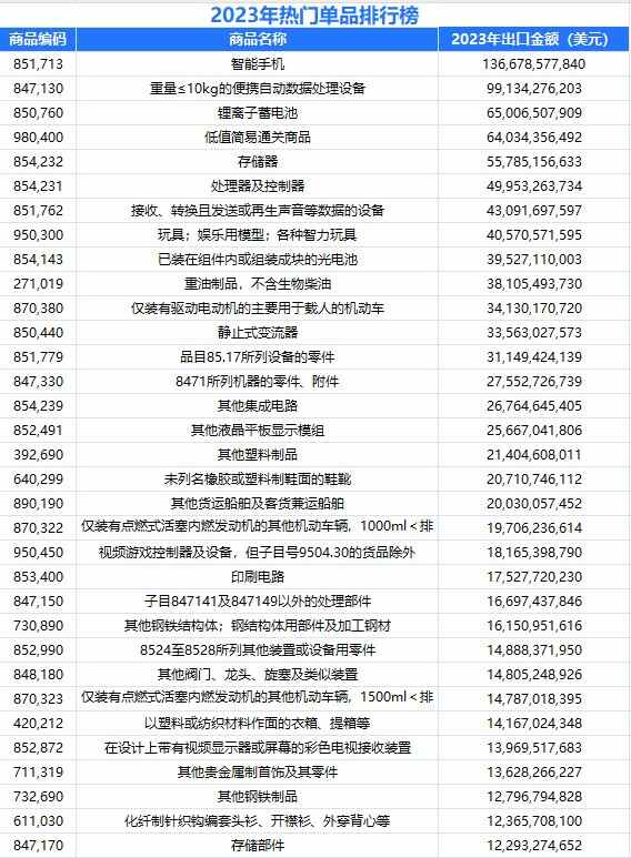 在前十名单品出口额的排名中,我们可以看到一些高端制造产品的明显优势。其中,智能手机以1366.8亿美元的出口额位居榜首,显示了其在全球市场的强大竞争力。
